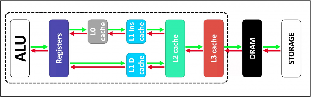 На схеме четко показан принцип работы с информацией, которая передается от хранилища к оперативной памяти, а от нее к кеш-памяти L3-L2-L1, и так до самого процессора. Процедура обмена данными закольцована.