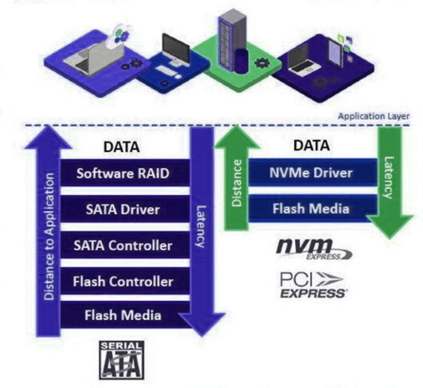 Звеньев в цепочке «процессор — накопитель» подозрительно много, как посредников между клиентом и продавцом, где каждый стремиться затормозить процесс (задержки). В NVMe-протоколе SATA-контроллер удалили как архаизм, что сильно повысило производительность. Также на общую скорость существенно повлияли твердотельные микросхемы NAND. Другое дело, что именно они теперь напрямую влияют на латентность памяти. Но производители уже придумали ряд технологий по увеличению производительности. Взять хотя бы 3DXpoint от Intel и 3D V-NAND от Samsung.